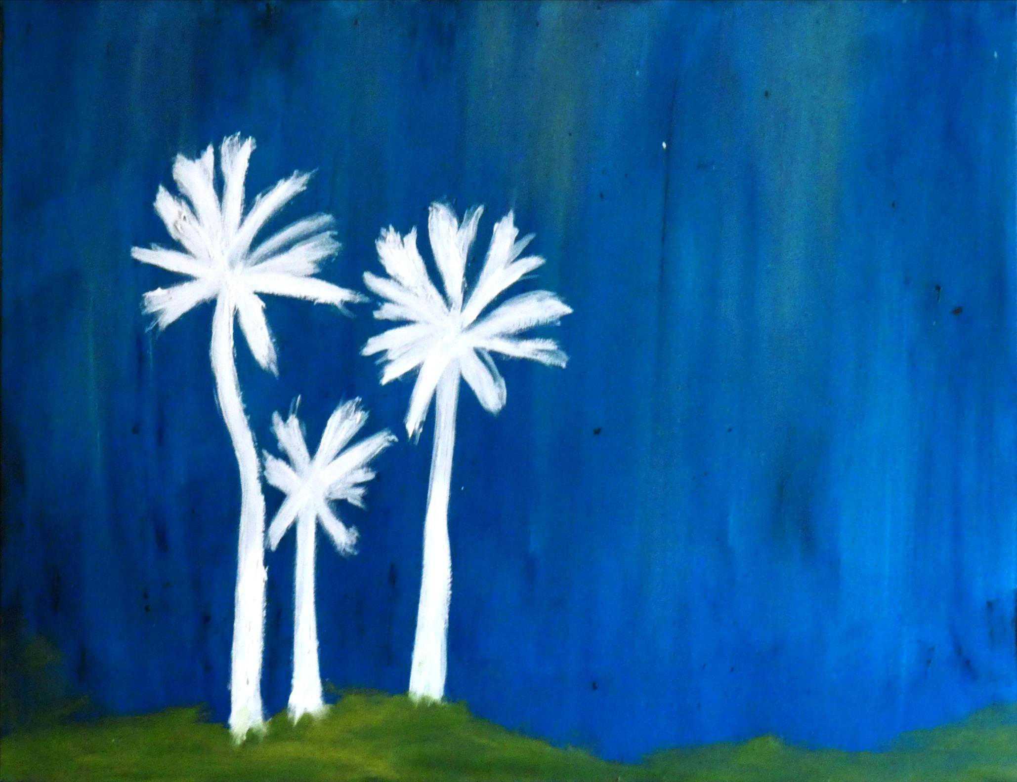 Les palmiers, peints en blanc éclatant, se dressent avec élégance, contrastant avec le fond bleu. Leur couleur lumineuse évoque la pureté et la fraîcheur, tout en symbolisant la paix et l’accueil. Les formes gracieuses des palmiers, avec leurs feuilles s’épanouissant vers le ciel, ajoutent une dynamique douce à la composition, créant un sentiment de mouvement dans cette oasis immobile.